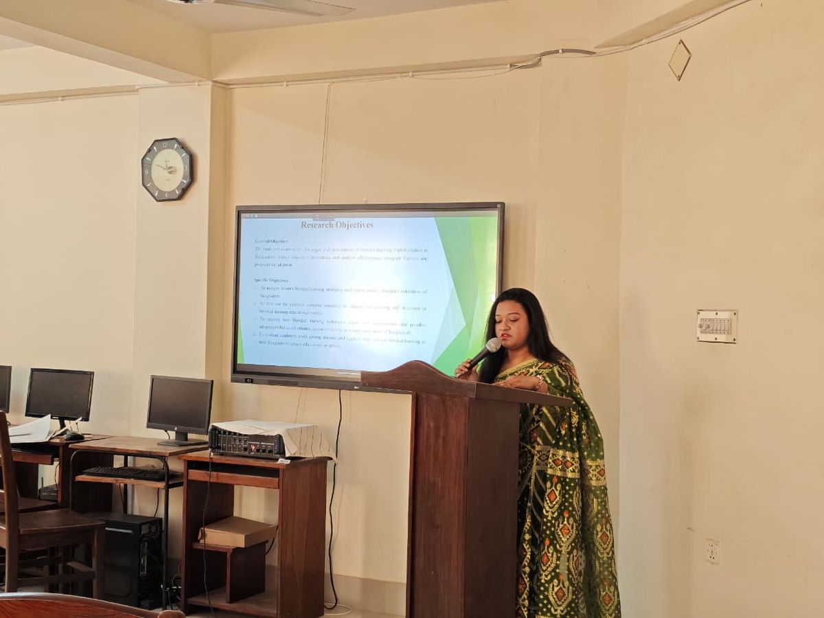 In her presentation, the researcher critically examined the ongoing shift toward blended learning in Bangladeshi tertiary education. The discussion focused on the current state of blended learning practices in universities, institutional readiness, technological and infrastructural challenges, and pedagogical issues faced by both teachers and students. The seminar also highlighted policy-level concerns and future prospects of blended learning in line with the vision of Digital Bangladesh and global educational trends